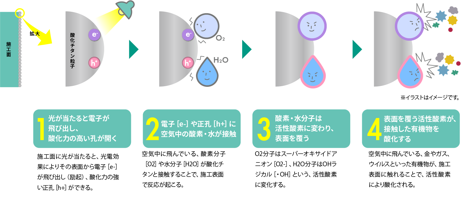 吹きつけるだけで、超微粒子の酸化チタン粒子が定着し、長期間にわたって「吹きつけた面」で酸化反応により