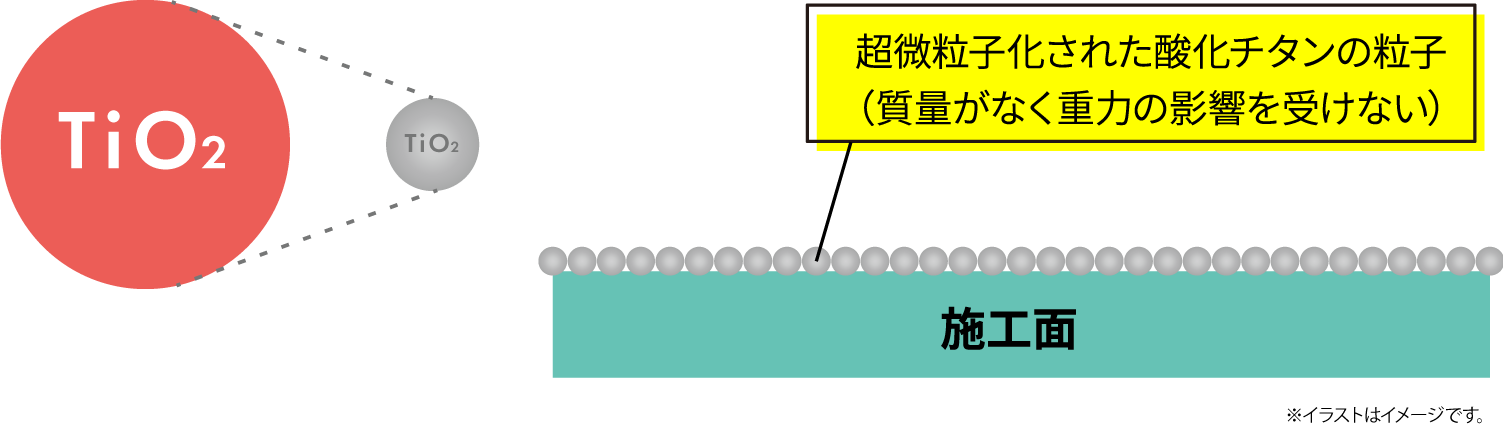 酸化チタン粒子のナノ化に成功したことで、分子間力(電気的な結合)によって自力で施工面に決着します。